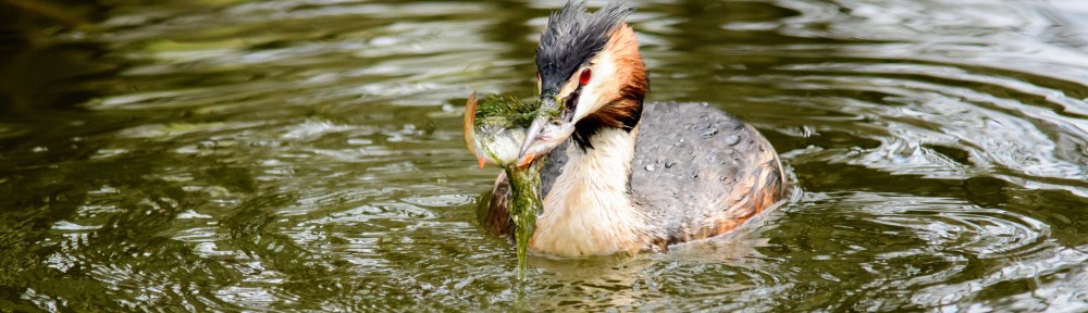 A few shots of a great crested grebe with lunch, taken at Watermead Lake, Aylesbury.